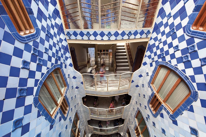 El tratamiento de las formas y del color, para obtener la máxima efectividad de luz, alcanzan su máxima expresión en el doble patio de luces que contiene la escalera y el ascensor. En estos patios, los muros se revisten con piezas de cerámica vidriada –algunas lisas y otras en volumen- en diferentes tonalidades de azul y donde las de mayor oscuridad se sitúan en la parte superior y las de color claro en los pisos inferiores. Mediante esta disposición cromática de los azulejos y gracias a la creación de ventanales de diferente tamaño, Antoni Gaudí consiguió que todas las plantas de la casa tengan una luz homogénea; permitió que el espectador que se sitúa en la parte inferior del patio perciba un color azul uniforme de tono intermedio al mirar hacia arriba, y creo una atmósfera única que te traslada al fondo del mar. Asimismo, consiguió evitar la sensación de pozo cuando se mira hacia abajo desde la planta superior. Observamos por tanto una genial solución de Gaudí para el reparto de la luz cenital a través del cromatismo y los volúmenes. Una luz que además penetra hasta el sótano a través de lucernarios y pequeñas claraboyas. Fue en esa búsqueda de fuentes de luz, cuando al reformar la planta noble Gaudí tuvo claro que quería aprovechar la luz de los tres lugares disponibles, por un lado la luz que procede del Paseo de Gracia a través de una gran tribuna abierta a la calle, por otro lado la luz del patio trasero, y, por último, la luz cenital a través de ventanas y aberturas en el patio de luces. Es en esta planta del edificio donde el arquitecto investigó con mayor intensidad la idea de planta libre que desarrollaría plenamente en la Casa Milà. Esta concepción permitió sustituir los muros de carga del edificio original por columnas y jácenas, creando muros-cortina con el mínimo de carpintería y con el objetivo de permitir el paso del máximo de luz posible a través de las vidrieras y consiguió inventar la ventana continua del Salón de la Planta Noble que permitía abrirse al exterior sin ningún tipo de interrupción. Para evitar un posible exceso de luz solar, aportó calidez situando en la parte alta del ventanal unas vidrieras emplomadas con diferentes variantes de azul y que suavizan la luz diurna. Cabe destacar que este recurso de incorporar vidrieras, lo repitió en diferentes puertas interiores permitiendo de este modo que las estancias que no daban directamente a una fuente de luz también la recibieran desde alguna de las tres fuentes. Otro espacio también destacado por el uso de la luz en este edificio es el desván y los pasillos que lo rodean, donde Gaudí se alejó del cromatismo utilizado en la fachada y los patios interiores y abogó por un único color: el blanco. Esta solución se aplicó con el objetivo de aprovechar al máximo la luz solar procedente de las aberturas de ventilación y dotó así a este espacio de toda la luz natural posible, una luz tamizada y suave, cuyo efecto se ve reforzado por la angulosidad de los tabiques enyesados y la ausencia de aristas. Aparte de estos tres destacados espacios de la Casa, vemos como cualquier estancia de la casa presenta lucernarios de mayor o menor tamaño que permite que todos dispongan de luz natural. Son así la luz y el color los elementos intangibles clave en esta obra maestra de la arquitectura de principios del siglo XX. En definitiva, cada edificio de Gaudí planteó innovadoras soluciones para aprovechar la luz solar, desde la cúpula con perforaciones circulares del Palau Güell hasta los arcos parabólicos enyesados de los pasillos del Colegio de las Teresianas, gracias a la disposición de los materiales, el estudio de las fuentes de luz natural y las tonalidades cromáticas Gaudí consiguió que cada obra brillase con luz propia.